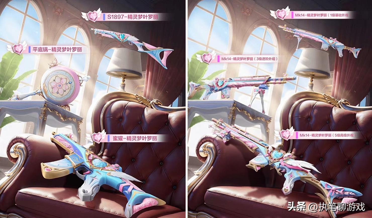 雖然4個角色均爲紫色等級,但是在皮膚方面卻應有盡有,槍皮方面有S1897、平底鍋、蜜獾以及MK14,其中的MK14作爲此次的主角,以7級槍的身份出現。