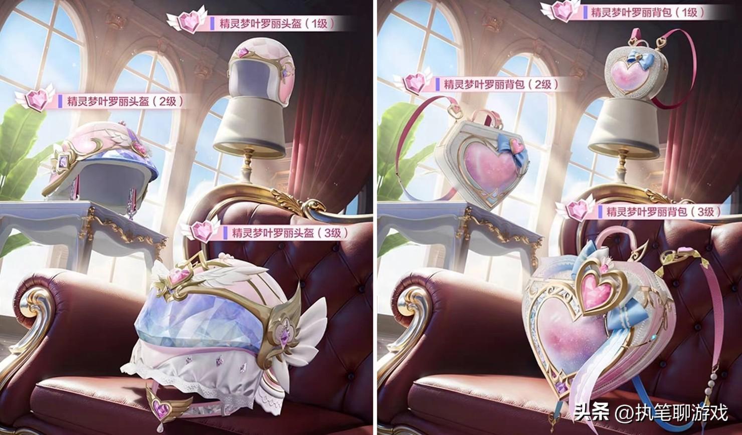 最後壓軸登場的是頭盔、揹包,相比以往的建模來講,這一次的頭盔還是讓人挺意外的,1級與2級雖然設計極爲簡單,但3級卻加入了“面紗”元素,搭配冰晶般的護目鏡,又以粉色、白色爲主,應該會得到不少玩家的認可,而且揹包是以“愛心”爲主題,體積也極小,符合大多數玩家的遊戲審美。