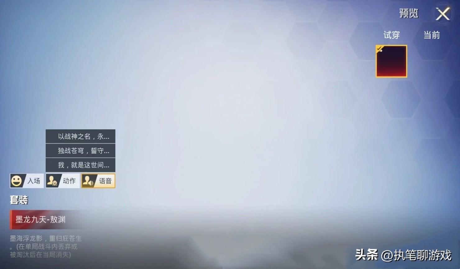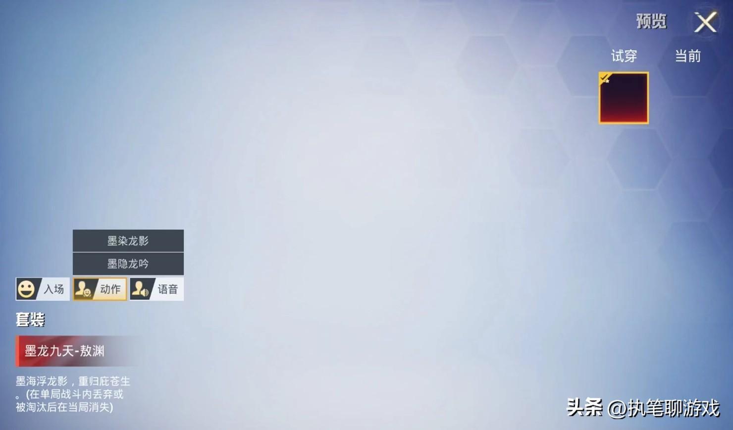首先是名字,新紅裝被命名爲“墨龍九天-熬淵”,與之前的升級紅裝相同,擁有專屬的入場、動作以及語音。