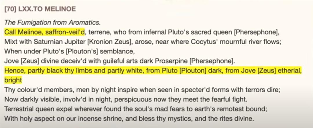 設計Melinoe時,我也查閱了一些相關資料,但可借鑑的信息並不多,我只能找到一些簡短的描述。比如《俄耳甫斯讚美詩(Orphic Hymn)》說Melinoe是身披藏紅花的仙女,時而光明,時而黑暗。