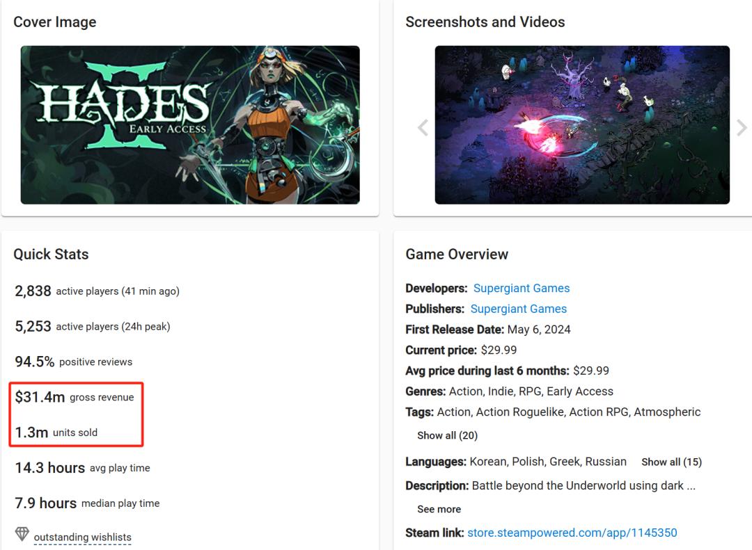 自5月7日突襲式上線、首發空降Steam全球熱銷Top 1後,據VG Insights統計,截至7月9日,《Hades II(黑帝斯2)》已賣出130萬份,收入約3140萬美元(摺合人民幣約2.28億元)。