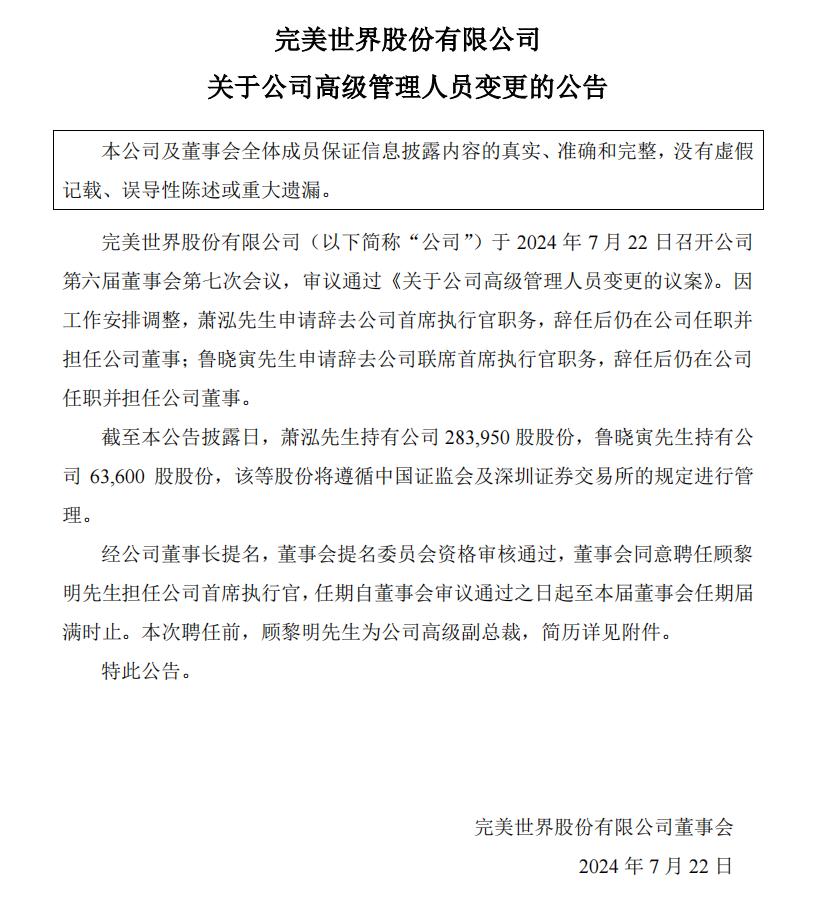 今天下午,完美世界發佈了一則公告(附於文末),宣佈聘任顧黎明擔任公司CEO,原CEO蕭泓、聯席CEO魯曉寅卸任後仍在公司任職並擔任公司董事。