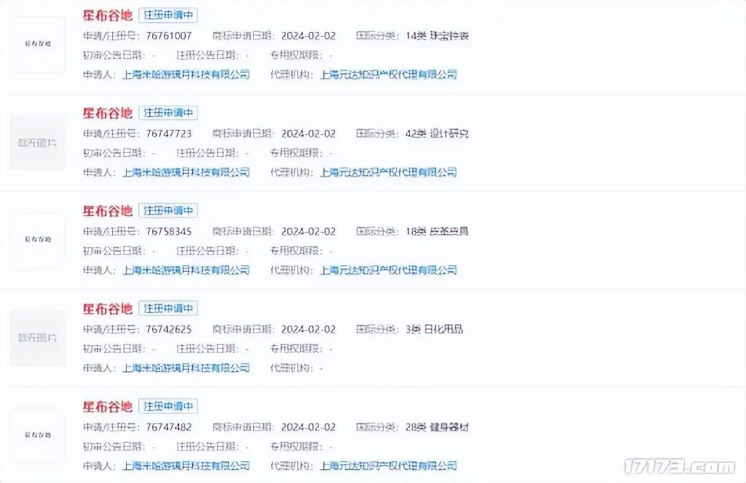2024年2月,米哈遊旗下的上海米哈遊璃月科技有限公司悄然申請了名爲《星布穀地》的新商標,其範圍橫跨了十餘個類別,曝光的瞬間在各大社交媒體引發了激烈討論。