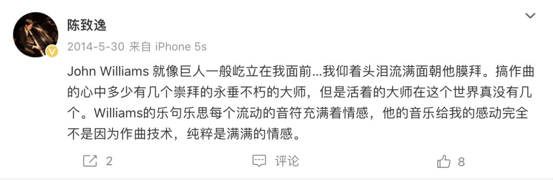 2014年,陳致逸還提到過一位將他帶向情感表達的偶像:參與創作了《星球大戰》等作品的電影配樂大師,約翰·湯納·威廉姆斯。“Williams的樂句樂思每個流動的音符充滿着情感,他的音樂給我的感動完全不是因爲作曲技術,純粹是滿滿的情感。”
