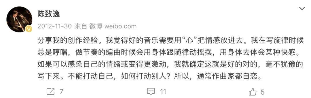 是了,使命。正如他之前也曾在微博寫道:我應該是揹負着這樣的使命才活在這個世上。我要創作出完美的音樂, 最好是要把自己的靈魂完整的注入在自己的作品中……未來的路原本就是不清晰的,探索者的恐懼不應該是未知,而是自我懷疑與不確定。人生就一次,有夢就去追,還沒到走投無路的時候呢,不妨再試試看。
