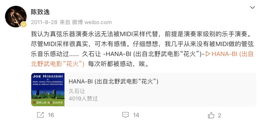 去年《原神》辦音樂會,我去看了一週的後臺彩排。只有站在那個位置,我才能明白陳致逸爲什麼堅持現場錄製——他很久以前轉發久石讓《HANA-BI》,就說自己還是喜歡樂手的演奏,覺得MIDI(電腦譜曲)沒有感情——看得出,他需要音樂有像真人一樣的語言,有真實的呼吸聲,才能和聽者建立對話。