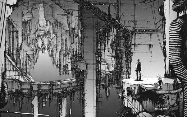 和傳統類魂遊戲的精力條不同,《無限機兵》中的同步率,不會隨着時間自動恢復。當玩家對敵人造成傷害則同步率上升,被敵人攻擊則同步率下降。這意味着,遊戲攻防節奏的變化會非常劇烈。當然,製作組設計這一機制,並非爲了限制玩家行動,而是鼓勵你用更多方式,也更有節奏地發動進攻。同步率的另一個作用,相當於你的藍條,可以消耗它來釋放各種技能。爲此,遊戲圍繞其設計了多種戰鬥機制。首先是,每一把武器,除了數值、模型和攻擊方式都有區別,還有各自的專屬武器技能。你可以將其粗暴地理解爲《艾爾登法環》的戰技系統,但消耗的是同步率而不是精力和藍條,因此,更需要玩家像一位武術宗師,在正確的時間用正確的招式,切忌無腦甩大招。另外,本作還設計了名爲“術士框架”的戰鬥系統。玩家可以在主角的左手,裝備各類特殊道具,獲得特殊能力、主動技能和數值強度。試玩版中,我們可以撿到主動技能“電磁炮”,用來發射一道傷害不俗的遠程激光——我就是主要靠這招,一條命就慢慢磨死了Demo的關底Boss。《無限機兵》還有一個細節是,當你視角鎖定敵人時,翻滾動作將會變成類似於《血源》的滑步,使戰鬥中的角色更靈活飄逸,攻防節奏也更快。特別是同時玩過《黑魂》和《血源》的玩家,應該非常清楚其中的區別。除了戰鬥系統,再聊點別的。我其實蠻喜歡這遊戲的場景風格,壓抑、黑暗、冰冷,建築錯綜複雜,機械殘骸四處遊蕩,具有濃烈的死亡和科技氣息。在之前寫的採訪稿中,有提到《無限機兵》的背景設定:一款啓示錄廢土科幻ARPG。植物滅絕後的人類文明也瀕臨崩潰,殘存的人類追尋着“淨地”的傳說,聚集到最後的城市海汶斯威爾。玩家將扮演擁有再生之軀的機兵少女“阿麗莎”,在破碎的城市遺蹟探尋末日真相,尋找世界新生的希望。遊戲的重要靈感來源之一,是貳瓶勉的科幻漫畫《Blame!》,標誌是鋪天蓋地的鋼筋混凝土叢林、濃重的死亡朋克系創作風格,以及大量留白的宏大世界觀。貳瓶勉曾在美國紐約獲得建築學學位,他也是我見過最愛畫建築的漫畫家,畫布中的大部分區域往往被各種扭曲怪異又巍峨如山的建築佔據,人在其中顯得異常渺小和孤獨。《無限機兵》的場景設計,就有些《Blame!》的神韻。目光所及之處幾乎都無序擴張的鋼筋水泥塊,雜亂地躺在地底,就像已經死亡了很久。一路遇到的,只有毫無感情的機械怪物、瀕死的難民,和暴走的戰士。耳邊傳來的迴響,只有鞋跟踩在鋼筋水泥上的迴音,孤獨且空蕩。當然,Demo的可玩內容着實有限,能聊的差不多也就這些了。從結尾PV來看,遊戲後續主角應該也會走出地底,前往更開闊的關卡區域。僅根據試玩版的體驗,《無限機兵》應該會是一款存在硬傷(操作手感)、也有亮點(戰鬥系統和美術設計),同時難度偏高的遊戲。但至於遊戲正式版本會呈現出何等水平,還不好下判斷。遊戲確定將登陸PlayStation5及Steam平臺,感興趣的玩家可以關注一下後續的消息。