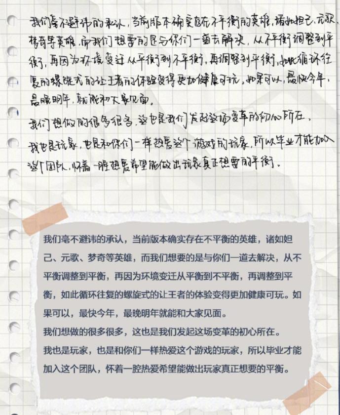 像是在上個月的大更新中,《王者榮耀》就爲了突出各個英雄的職業特色,調整了諸多英雄的基礎屬性。在《策劃開麥了》直播中,平衡策劃也對很多問題一一做了回覆,還挺真誠地念了一封手寫信表態:這些英雄調整,就是要修正長期無序的英雄基礎屬性,讓每個職業定位更加明確,每個英雄能發揮出自己的特色。