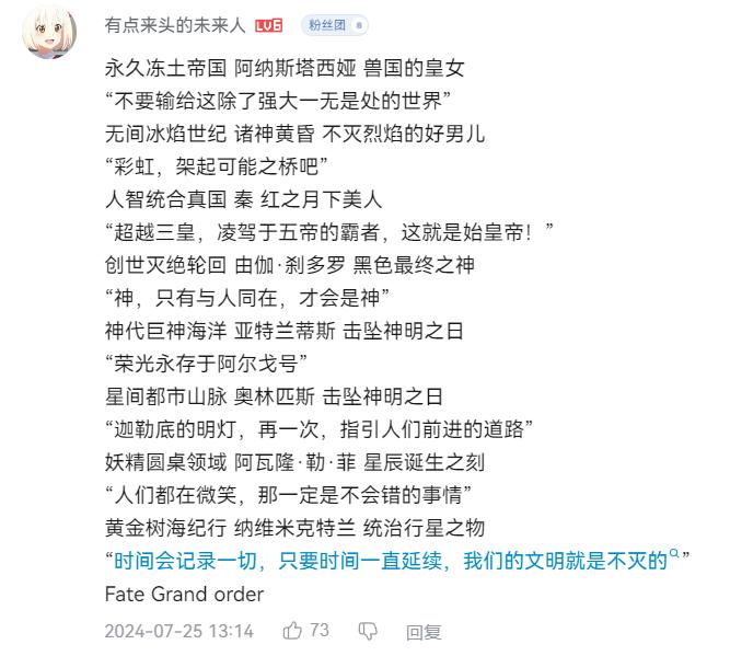 所以能看到評論區裏熱門的長評,都是在感慨FGO內容創作的獨到之處,其中很多臺詞更是成爲經典,只要默唸一遍就能讓人觸動。