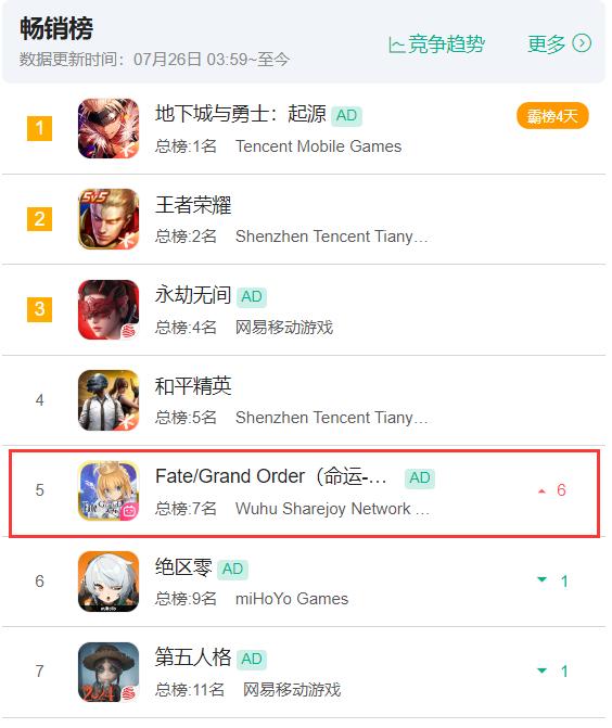 先說成績吧,隨着八週年活動的開啓,FGO的暢銷排名迅速衝到第五位。這不僅是FGO最近一年來暢銷成績的最高點,也是頂着7月新作熱潮的壓力,硬生生搶到的位置,實屬來之不易。