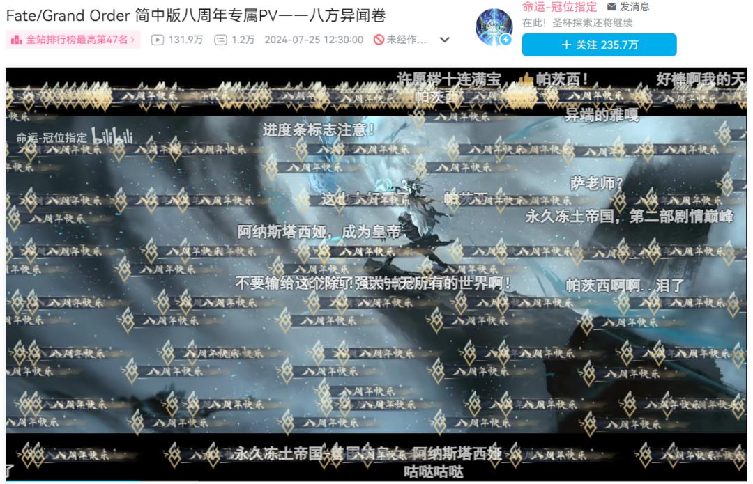 再看玩家的反響,今年FGO週年慶很特別的一點,是推出了簡中專屬週年PV《八方異聞卷》。毫無疑問,它在FGO國內玩家圈裏徹底爆了,鋪天蓋地的「八週年快樂」從PV開頭一直刷到了PV結尾。