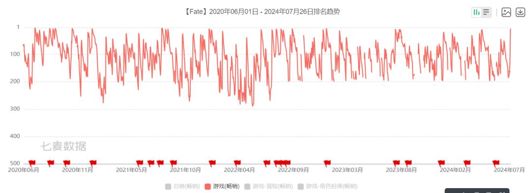 先從數據角度看,在國內上線八年FGO如今依然有充足的爆發力。以二遊競爭最激烈的過去4年爲例,FGO幾乎每年都有2~4次闖入暢銷Top 10,只是隨着市場上誕生越來越多的頭部產品,進入高位的機會變少,但整體上波動幅度的變化不大。