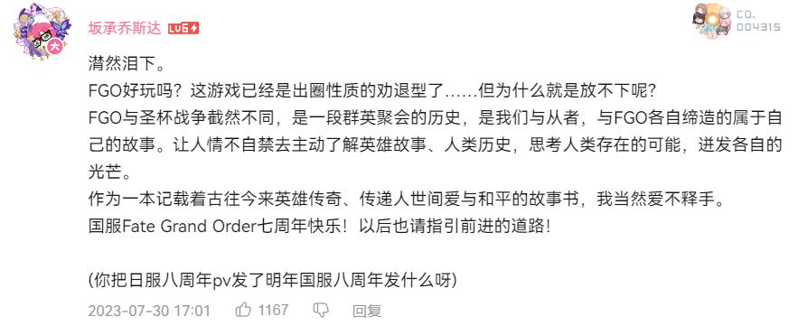 今年簡中專屬PV裏玩家表現出來的的情感共鳴,說明過去數年的沉澱已經讓很多人打心底裏熱愛着FGO、熱愛着Fate。當這種認同感遇到「一部足夠優秀和能觸動人」的作品,那就會被瞬間點燃。