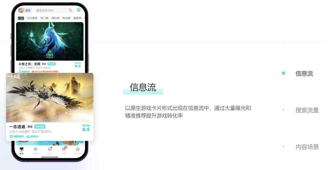 而且很多人可能還不知道,TapTap爲了整合資源,把流動的流量捕獲下來,偷偷做了個奇葩的、流量相關的新業務:廠商可以拿遊戲素材、品牌內容、軟著版權等資源,跟TapTap換取流量。