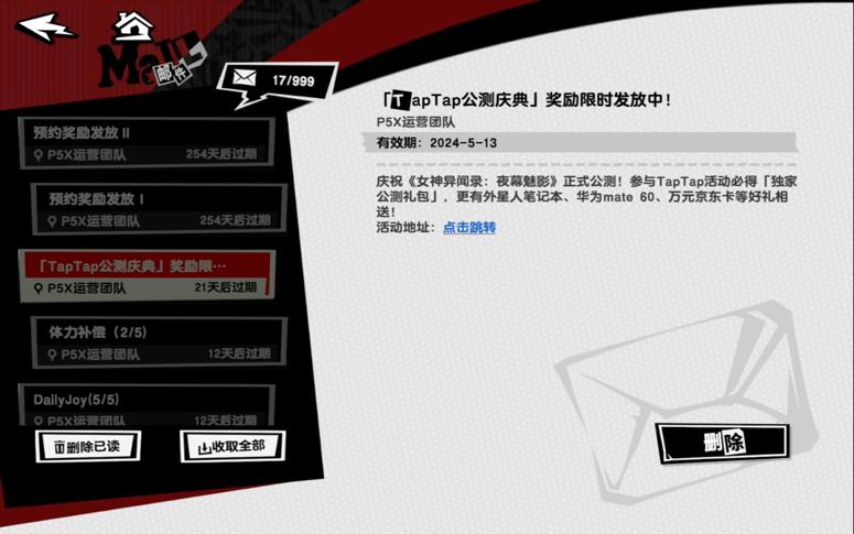 比如《女神異聞錄:夜幕魅影》公測的TapTap全員郵件,就是一種資源