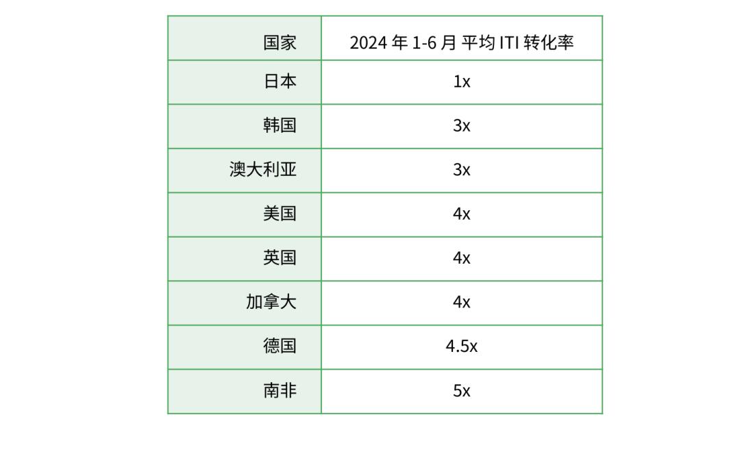 報告統計了不同市場2024年展示安裝轉化率(ITI),用於反映營銷和投放對實際效果的影響程度。根據數據,日本是目前轉化率最低的市場之一,而韓國、美國、澳大利亞等市場的轉化率,是日本市場的3倍以上;南非的轉化率是日本的5倍。