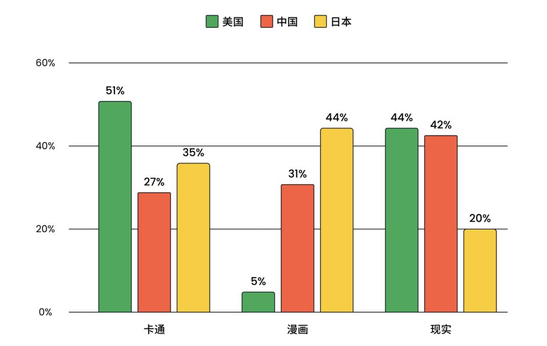 日本卡通、漫畫、寫實的流行比例爲35:44:20,對“二次元”的傾向程度達到了八成。