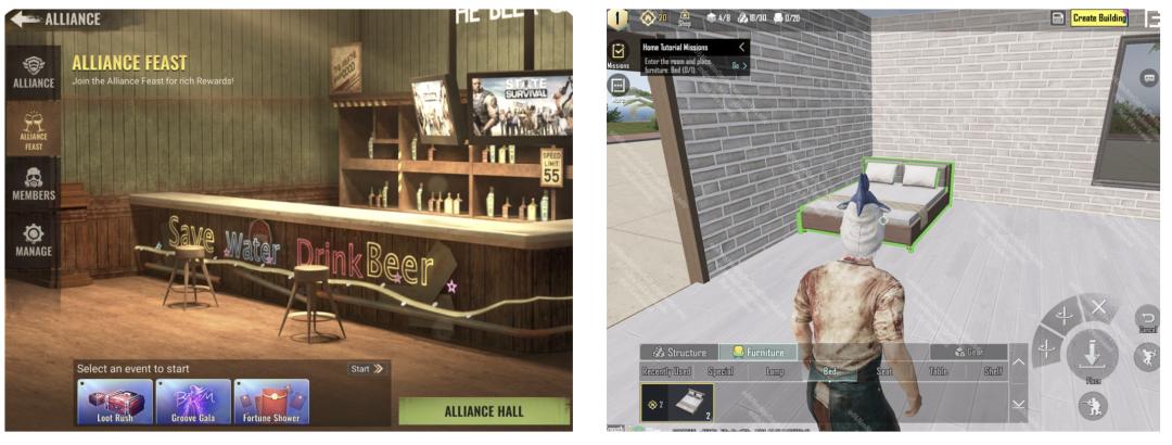 報告分析,出海遊戲在玩法方面設置社交聚會系統、家園系統正成爲一種創新趨勢,比如《State of Survival》中的聯盟大廳(Alliance Hall)、《 PUBG Mobile》的家園系統。