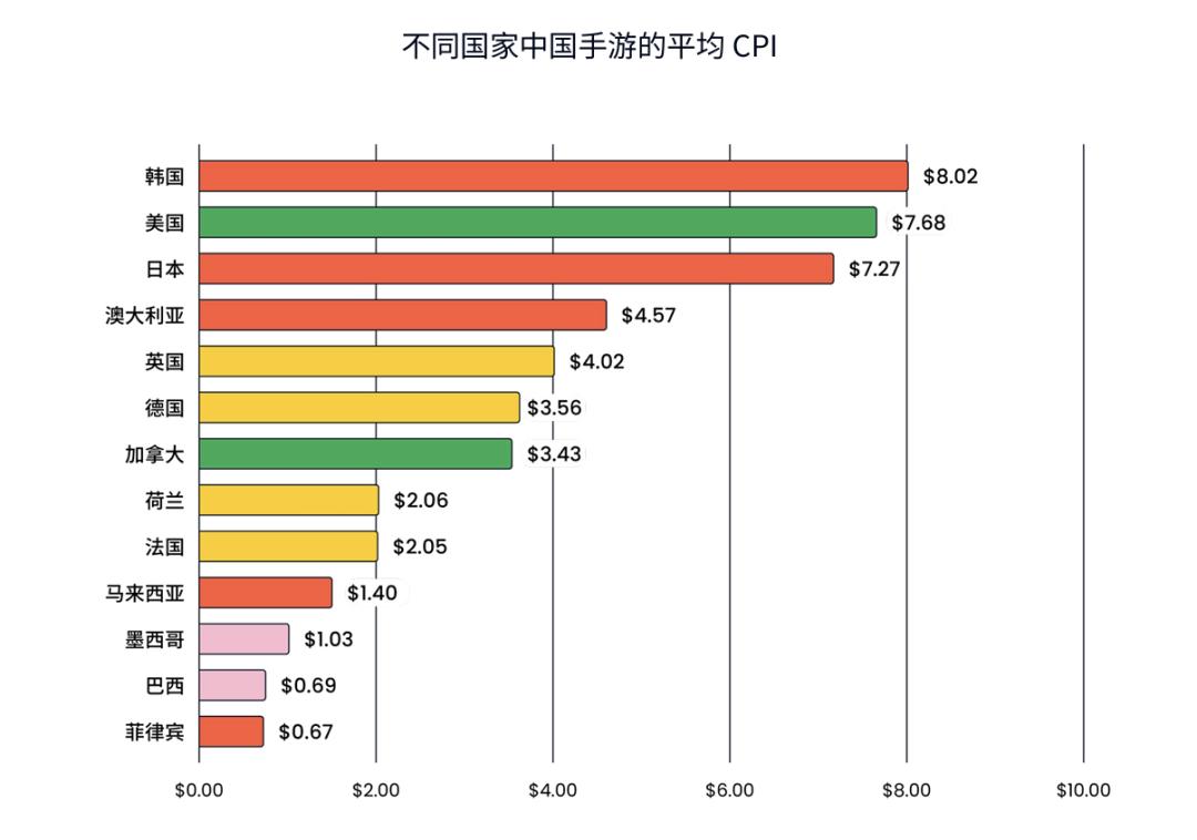 按具體市場劃分,獲客成本最高的TOP 3爲韓國、美國和日本,最低的爲墨西哥、巴西和菲律賓,兩方的獲客成本最高相差12倍。