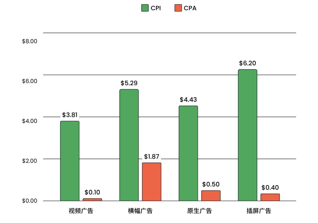 據統計,中國出海手遊的廣告類型中,視頻廣告的CPI(每次安裝的成本)和CPA(每次用戶行爲的成本)更低,大概有3.81美元和0.1美元,這意味着該類型廣告的效果更好;插屏廣告的CPI較高,意味着最難觸發用戶安裝;橫幅廣告CPA較高,是視頻廣告的18倍,或許證明用戶對該類廣告的關注度更低。