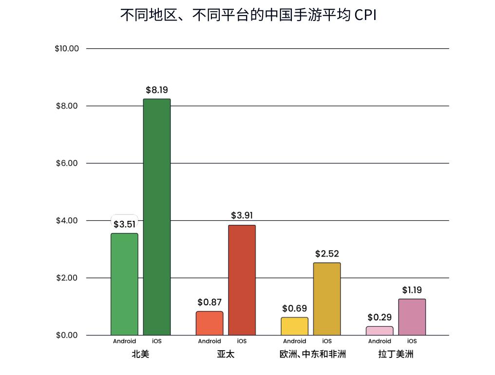 報告顯示,中國手遊在全球不同市場的獲客成本不同,整體來看北美市場競爭更加激烈,其安卓和iOS獲客成本是拉丁美洲的12倍和7倍。