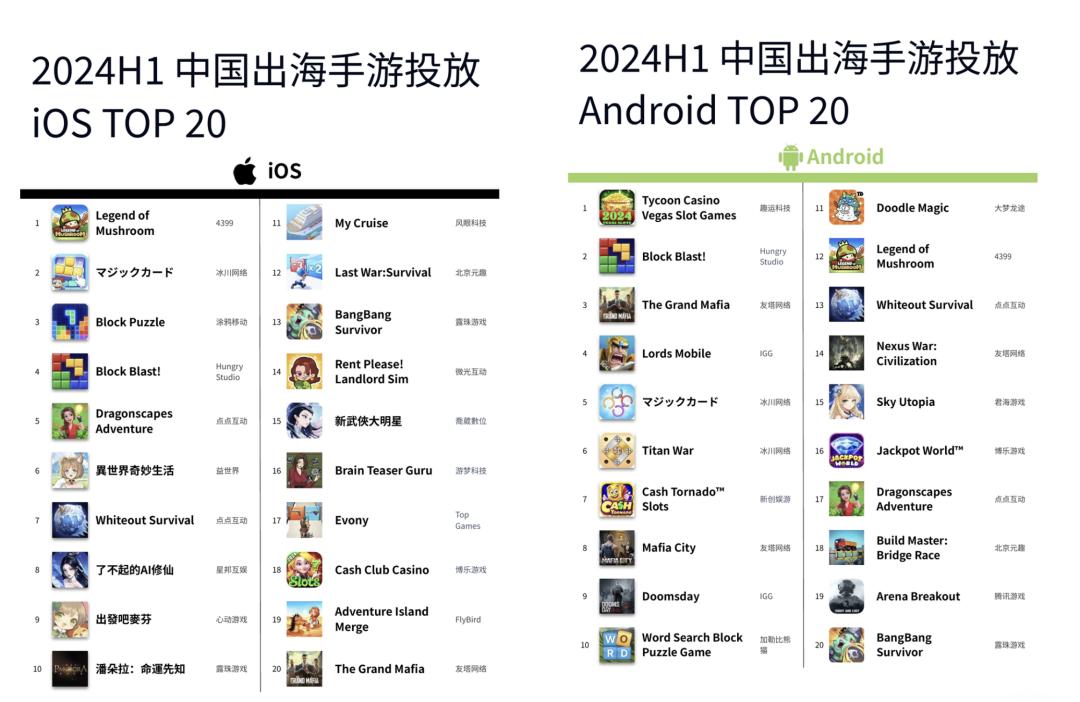 報告顯示,2024上半年在iOS渠道投放最多的出海產品爲4399《Legend of Mushroom》、冰川網絡《マジックカード》、塗鴉移動《Block Puzzle》;安卓渠道投放最多的出海產品爲趣運科技《Tycoon Casino Vegas Slot Games》、Hungry Studio《Block Blast!》、友塔網絡《The Grand Mafia》。