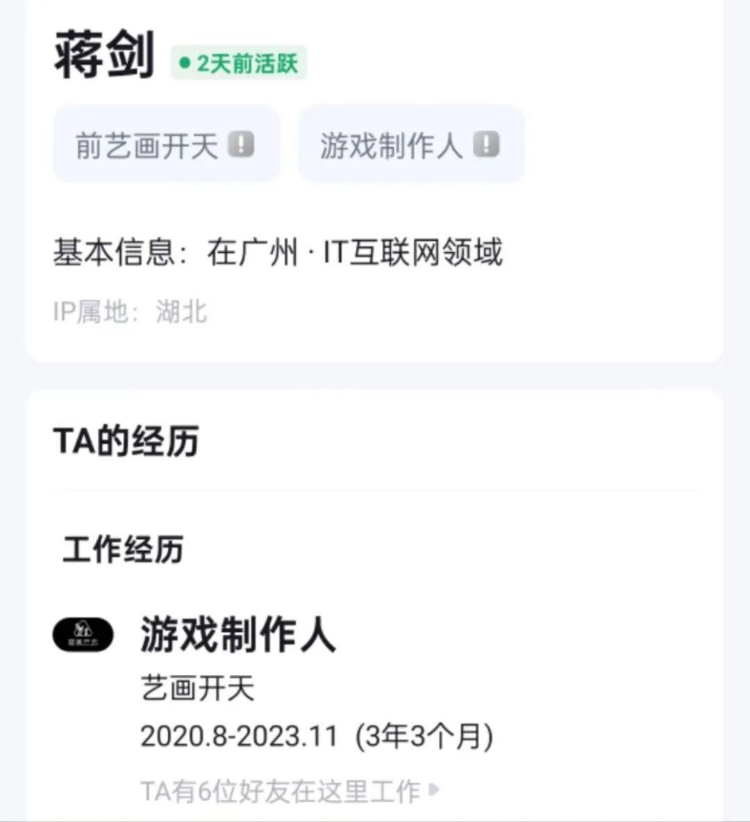 有內部人士稱,賀甲已經是《凡應》的第三位製作人。遊戲的上一任製作人,是曾在珠海漩渦科技有限公司擔任製作人的蔣劍。從脈脈帳號來看,他在藝畫開天工作了3年3個月,並最終於2023年11月離職。就在同期,《凡應》的官方微博也停止了更新。
