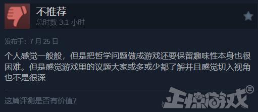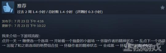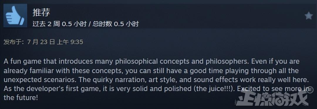 —4美元的遊戲價格讓我覺得良心,但全程都是製作人對哲學的個人化表達,沒有對我做出的選項做出解釋與分析,感覺在玩一個爲了搞笑而搞笑的遊戲。