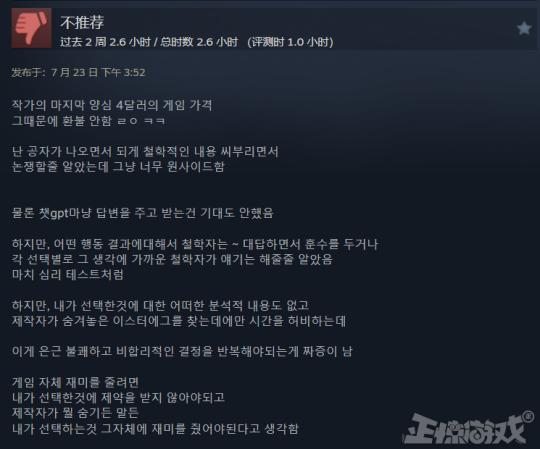 小弟有話說:需要重點說明的是,跟大部分玩梗遊戲差不多,並不是所有人都能get到《哲學梗模擬器》的幽默感,也不是所有人都覺得這款遊戲太輕佻,不夠嚴肅。小弟只是從評論區的評論佔比來看,日韓網友普遍得覺得不夠嚴肅,歐美樂子人比較多,也不能一棒子打死所有人哦。