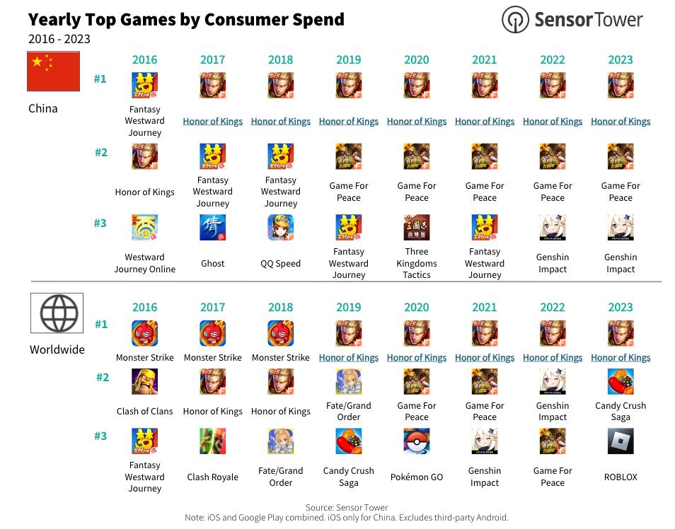 2024年6月,騰訊《王者榮耀》躋身全球手游下載量增長榜第二名。從全球範圍來看,該遊戲在2019年至2023年間,憑藉在中國iOS市場的收入,該遊戲位列全球iOS和Google Play雙平臺總收入榜單第一名。