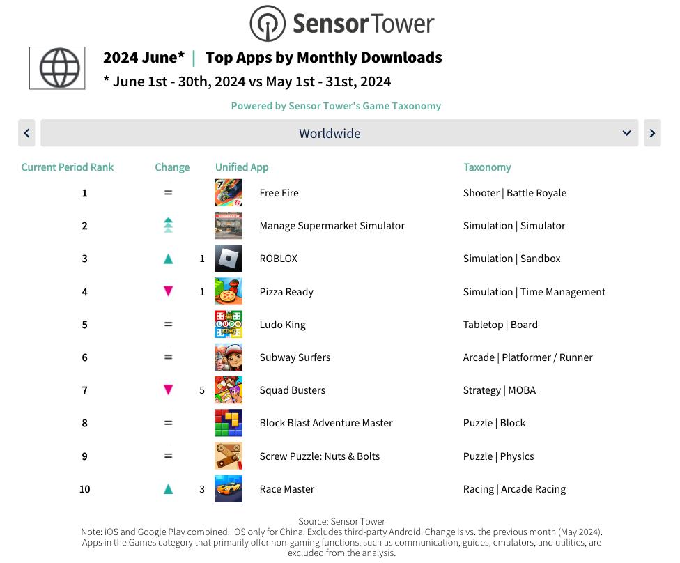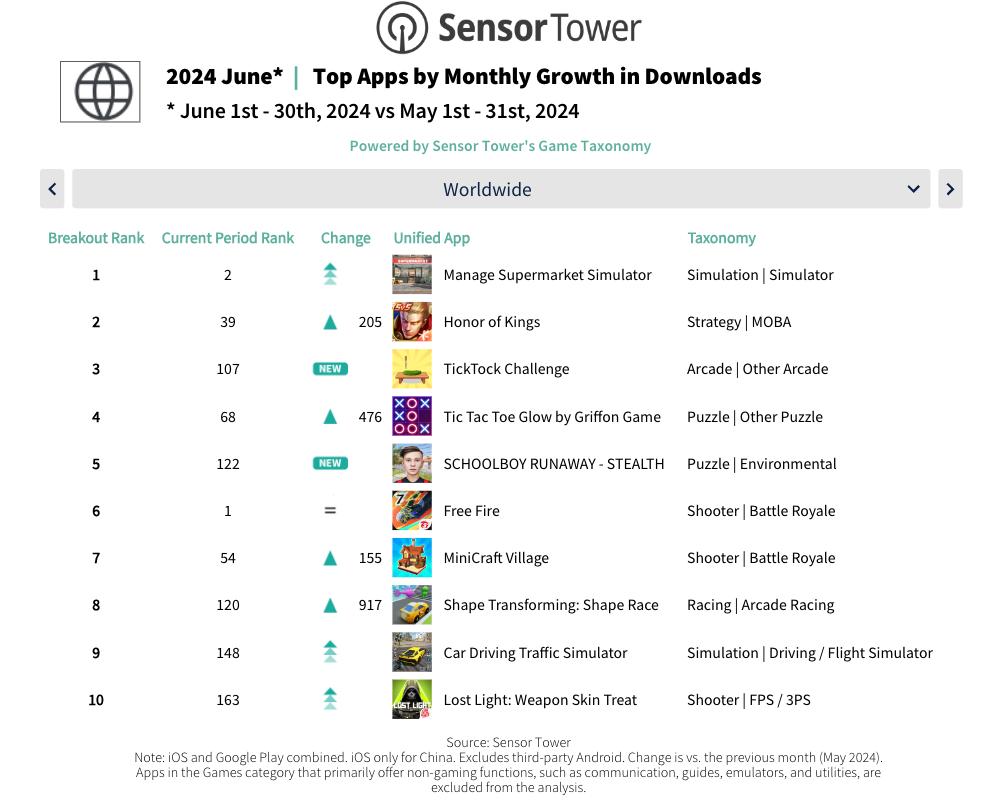 7月31日,Sensor Tower公佈了6月移動遊戲在全球市場的下載和收入情況。