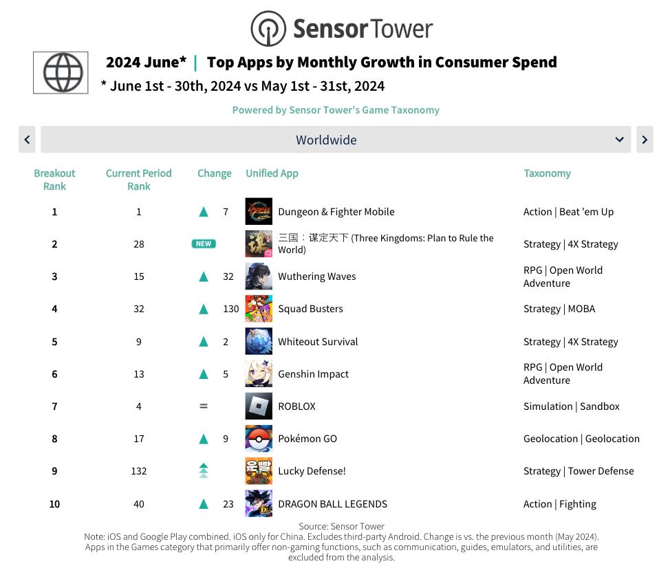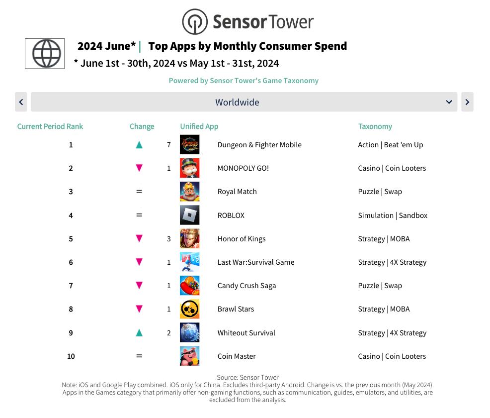 由騰訊發行的國服版本《地下城與勇士:起源》,在2024年5月登陸中國市場,並在6月吸金近2.51億美元(合約人民幣18億元),成爲本期收入最高的手遊。