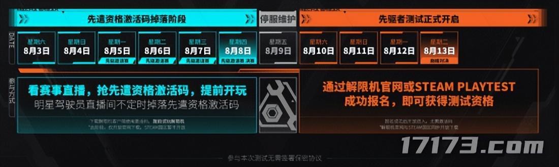 “先驅者行動”測試預計將於 8 月 3 日 10:00 開服,本次測試爲限號不計費刪檔測試,駕駛員可通過先遣體驗激活碼激活測試第一階段資格。