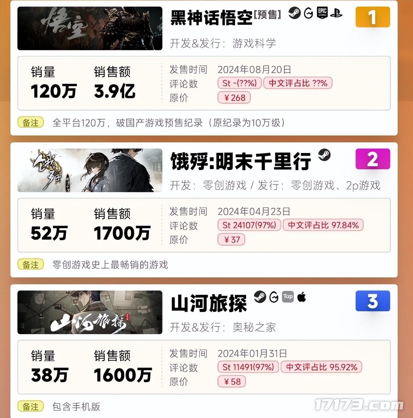 在銷量方面,《黑神話:悟空》的預售成績令人矚目,已突破120萬份,這一數字遠超2024年同期發佈的其他國產單機遊戲,可謂遙遙領先。