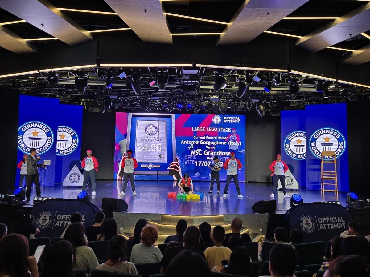 我還記得,在最後一個航行日,6層甲板的榮耀大道上舉辦了一場吉尼斯世界紀錄挑戰。現場放置了堆樂高、拉繩子、扔船長帽、傳遞球等幾個挑戰項目,前兩個如果破紀錄是真的能拿到吉尼斯證書的,而後面則是娛樂體驗項目。