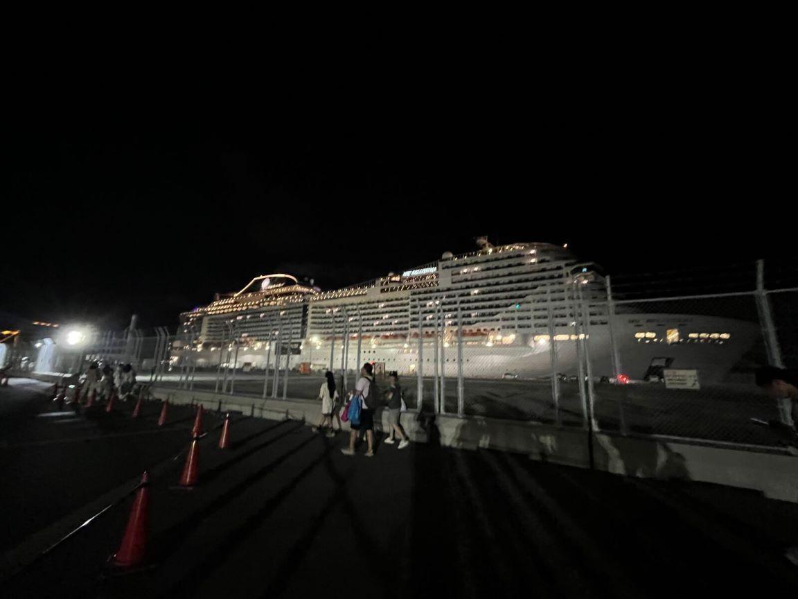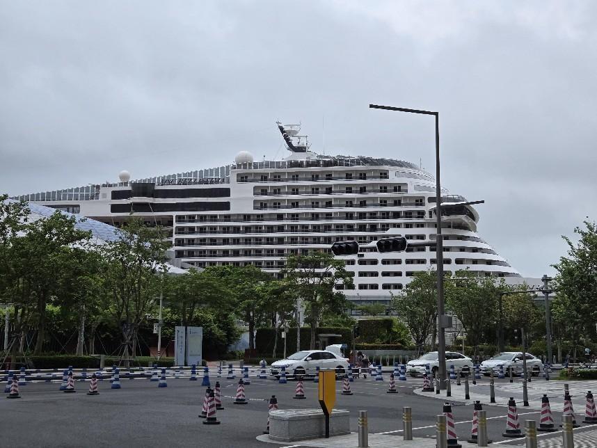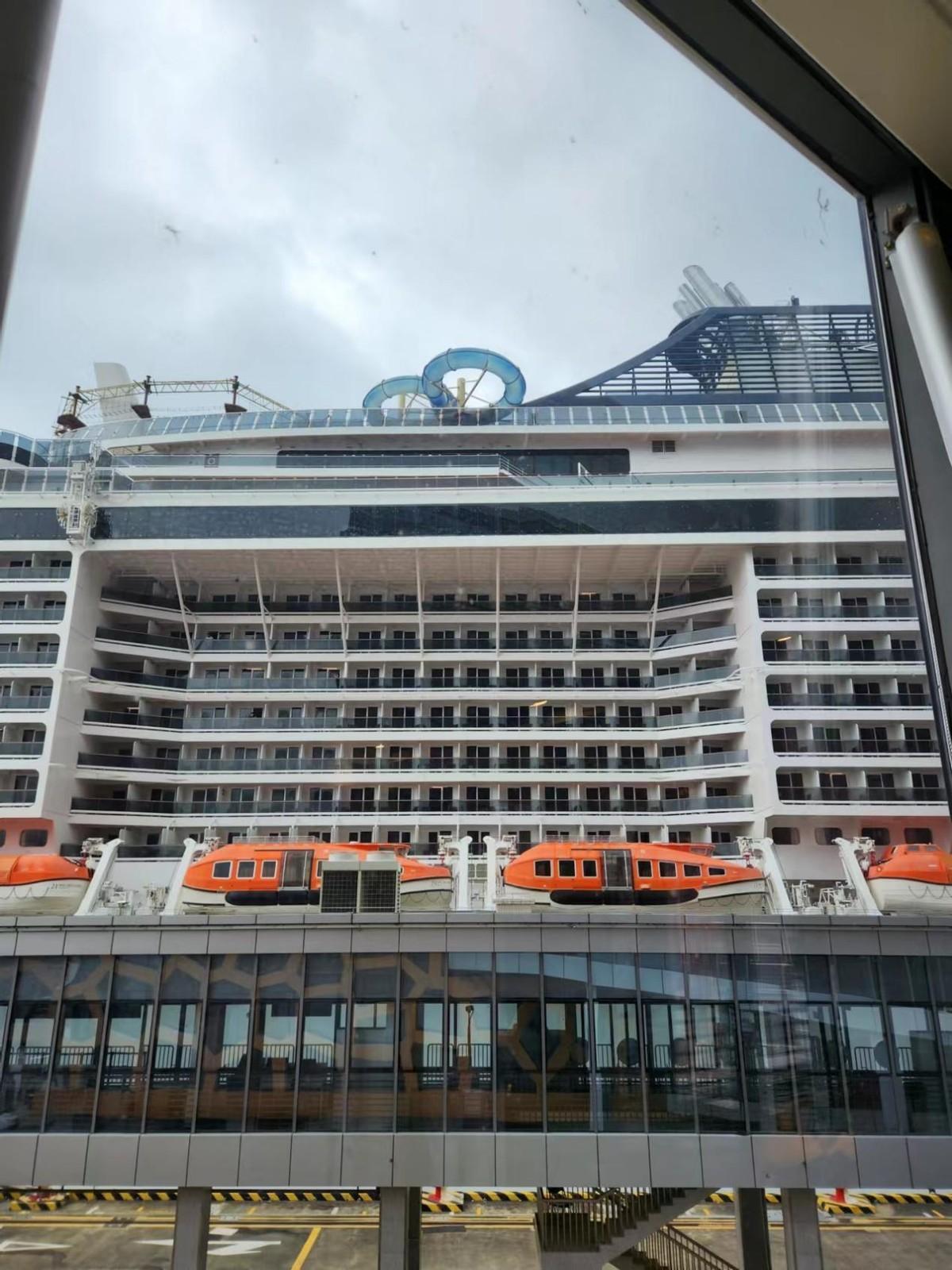7月末,我在蛇口碼頭見到了即將搭乘的“MSC榮耀號”。這是一艘長300多米、高70多米的大型郵輪,擁有19層甲板、2217間艙房,載客量高達5655人。光看數據可能不夠直觀,但我在碼頭外第一眼望見靜止停靠的郵輪,還以爲這是一棟辦公大樓。