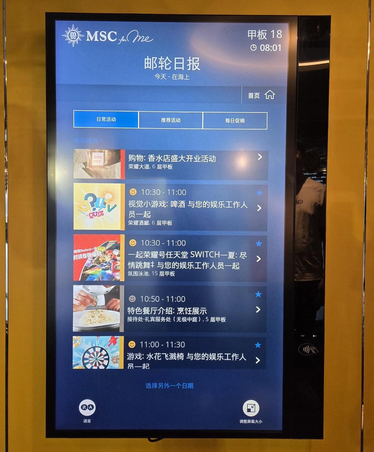 多數遊客都會在上船的前兩天,花時間“熟悉地形”,畢竟船上可玩的設施、項目實在太多了。每天房間裏都會收到“每日活動”的安排表,在MSC的App、船上各處的顯示屏上也能即時查看。每個航行日,從早上8點到晚上23點基本是排滿的,不用愁沒東西玩。