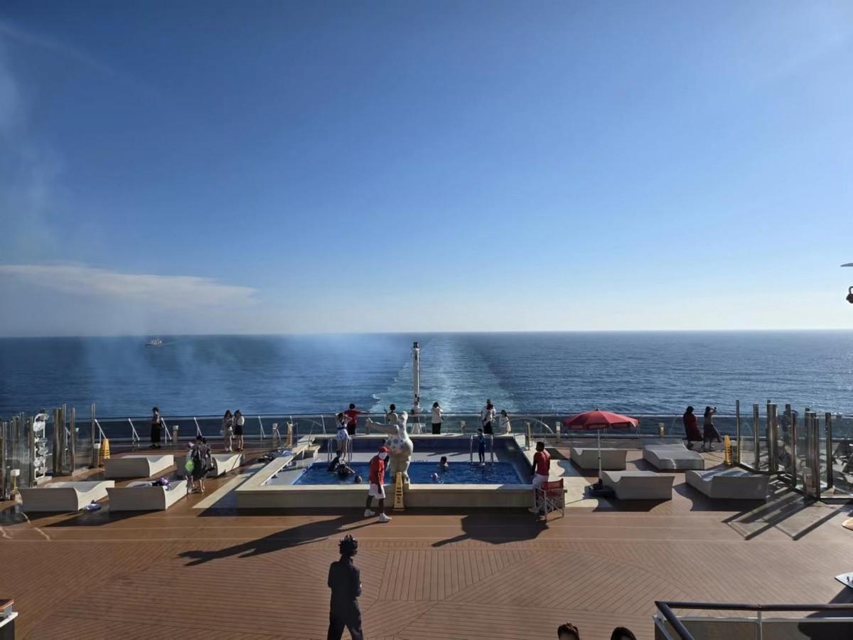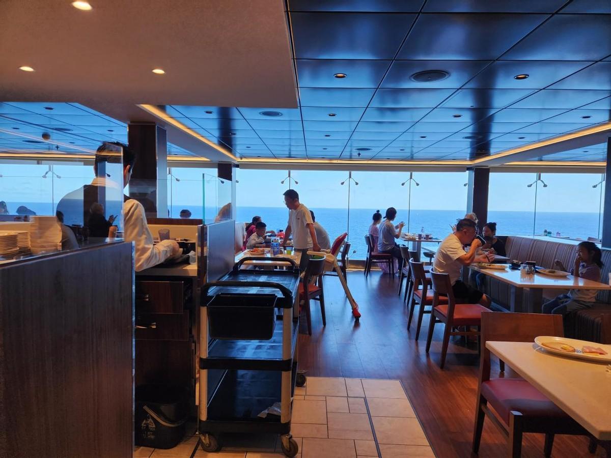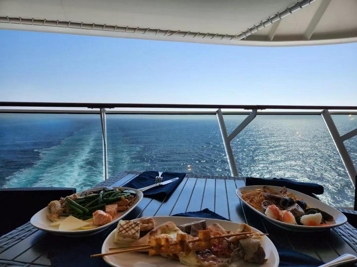 還比如15層甲板的“市集自助餐廳”,又大又寬敞,四周能看到海,每天免費開放20個小時,這意味着,我幾乎可以在任何醒着的時候去喫飯。繞到自助餐廳的後方,可以前往甲板陽臺區域,在這裏喫飯體驗也不輸任何高檔餐廳。