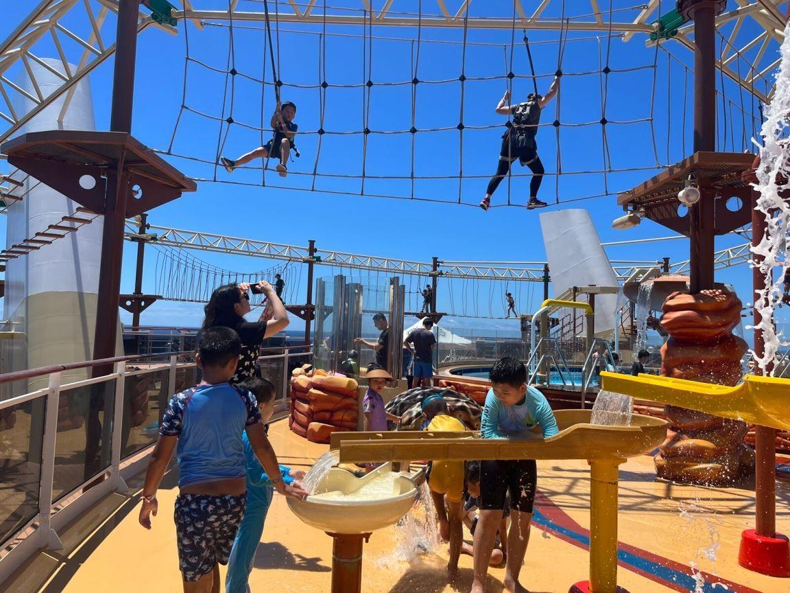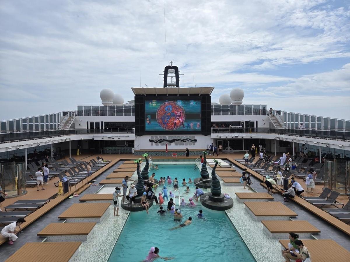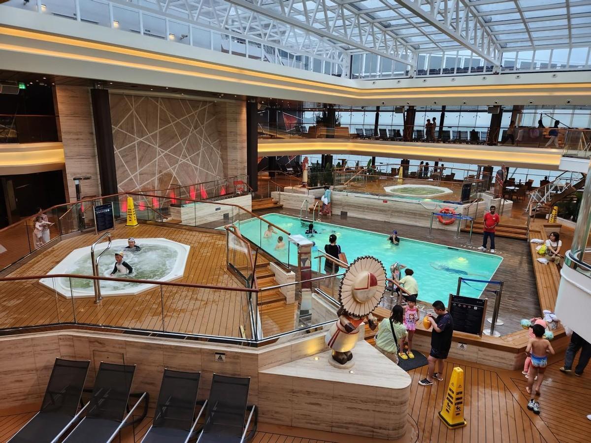 船上光是大大小小、室內室外的泳池就有好幾個。有趣的是,幾乎每個泳池邊上都有酒廊,大人點杯喝的坐着聊聊天,看着孩子們放飛天性瘋玩,真的很有度假感。