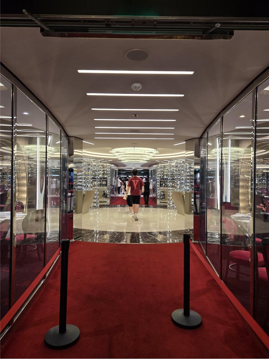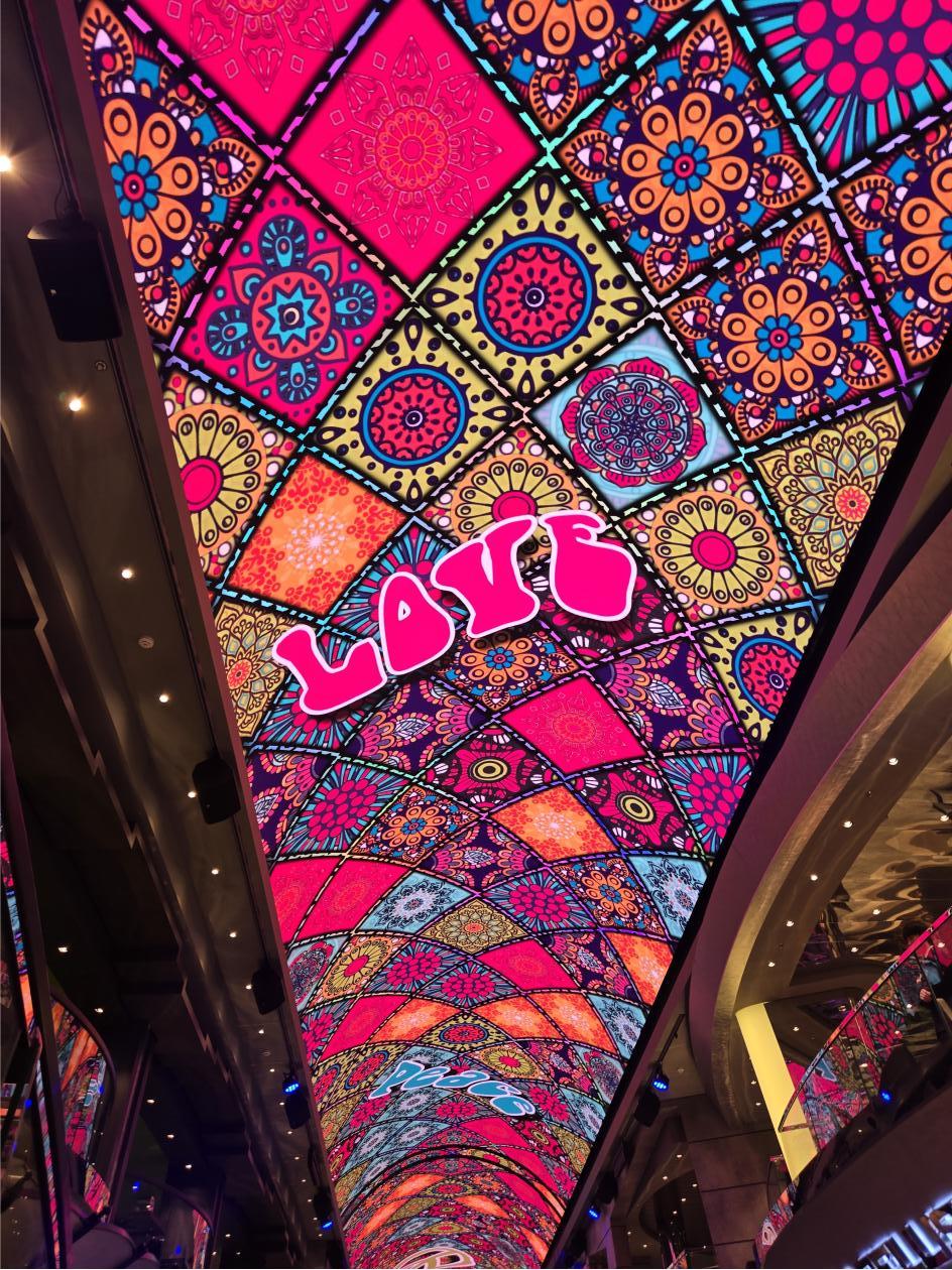 我登船的位置是6層甲板中部,映入眼簾的便是6、7層甲板中部挑空的大廳長廊“榮耀大道”。活潑動感的基調從這時就定下了,船員們會跳着舞,夾道歡迎大家,一旁會有攝影師拍照,頭頂則是長80米海上超長LED天幕。