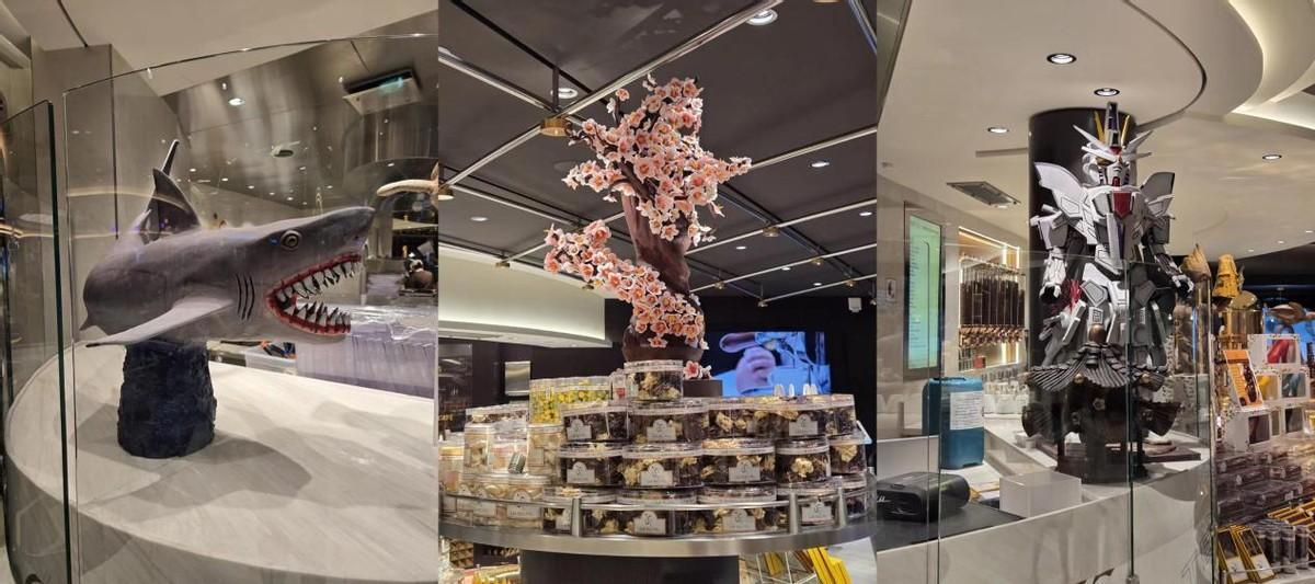 榮耀大道的兩旁分佈着冰激凌屋、巧克力工坊、咖啡廳、酒廊、奢侈品商店等等店鋪設施,雖然我對諸多英文高檔品牌都不熟悉,但也能感受到它們都大有來頭。比如JEAN-PHILIPPE 巧克力工坊&咖啡屋,就由法國巧克力和甜品大師Jean-Philippe Maury打造,在櫃檯前、貨架上展示着用巧克力製作的鯊魚、哆啦A夢、高達...把這片區妝點得像藝術館。