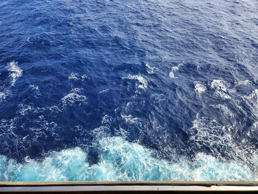 相比之下,我的震撼時刻是從室內走上室外甲板的瞬間:溫熱的海風衝向臉頰,推着我往略顯潮溼的甲板上走,低頭看船邊打起的浪花,抬頭是一望無際的波光,被大自然包裹又置身於安穩的環境,足以讓人放下所有的戒備。