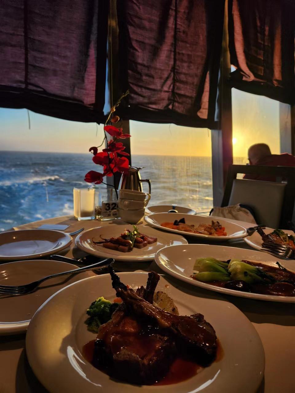 如果恰好能在船尾靠窗的位置就餐,還能看到日落的美麗景色。