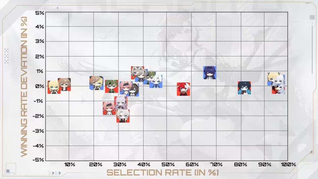 不只基礎紮實,《卡拉彼丘》也在持續優化遊戲的競技內容,包括不同角色的平衡調整、匹配機制的調整、角色選取率/勝率信息公佈等等,拿製作人當時的話來說,就是儘量拉通官方和玩家的信息透明度,讓他們知道你爲什麼這麼做,有什麼顧慮,有什麼想法。