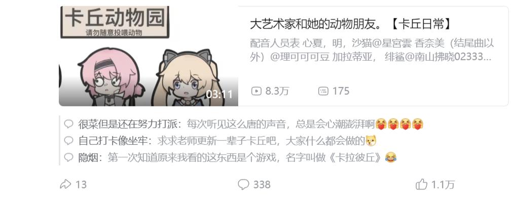 從外部也能看出來,雖然《卡拉彼丘》當前的熱度很難與開服時相比,但其官方B站視頻還是能保持幾十萬的播放量,玩家整活或炫技的視頻也總能拿到不錯的播放量和討論——有意思的是,《卡拉彼丘》的表情包也偷偷成了不少羣友吹水的本錢。