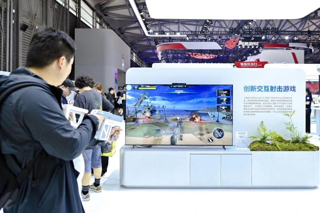 據展臺工作人員介紹,這款槍型外設深入適配了FPS遊戲的瞄準、射擊等操作,並通過震動馬達進行後坐力等及時交互反饋;華爲智慧屏靈犀指向功能也能幫助玩家進行瞄準,獲得更沉浸的體驗。