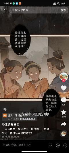 以下面的素材爲例,它運用了連環畫、小人書等視覺元素,講述了一個縣令治理城邑的小故事。雖然素材中有一些對遊戲玩法的基礎介紹,但卻沒有直接引導你進行下載,而是通過故事情節喚起潛在玩家的好奇心,間接地推廣遊戲。