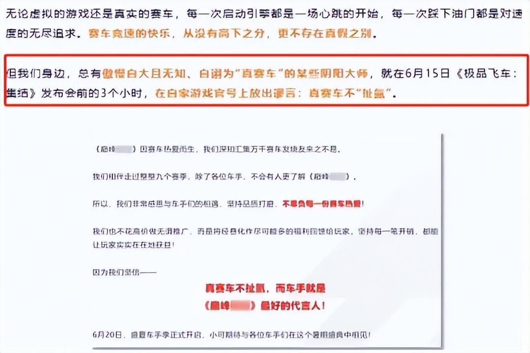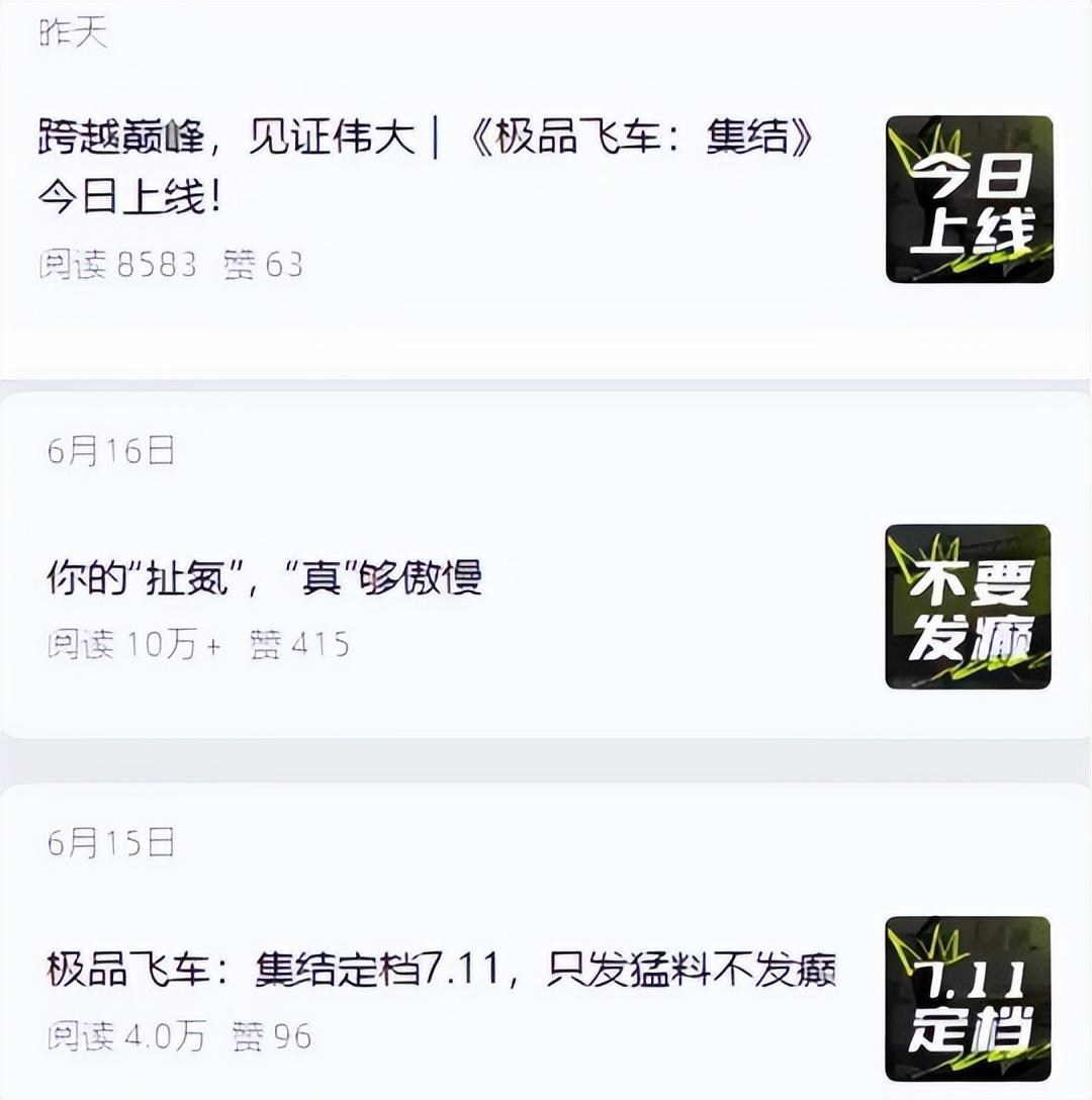7月鬧得最兇的一次商戰無外乎是騰訊新遊《極品飛車:集結》在做前期宣傳時,官方公衆號多次Cue到了網易旗下的競品競速手遊《巔峯極速》,都到了撕破面皮開罵“你的扯氮,真夠傲慢”,陰陽怪氣《巔峯極速》自詡“真賽車”遊戲,卻在宣傳“真車不扯氮”,傲慢自大且無知。