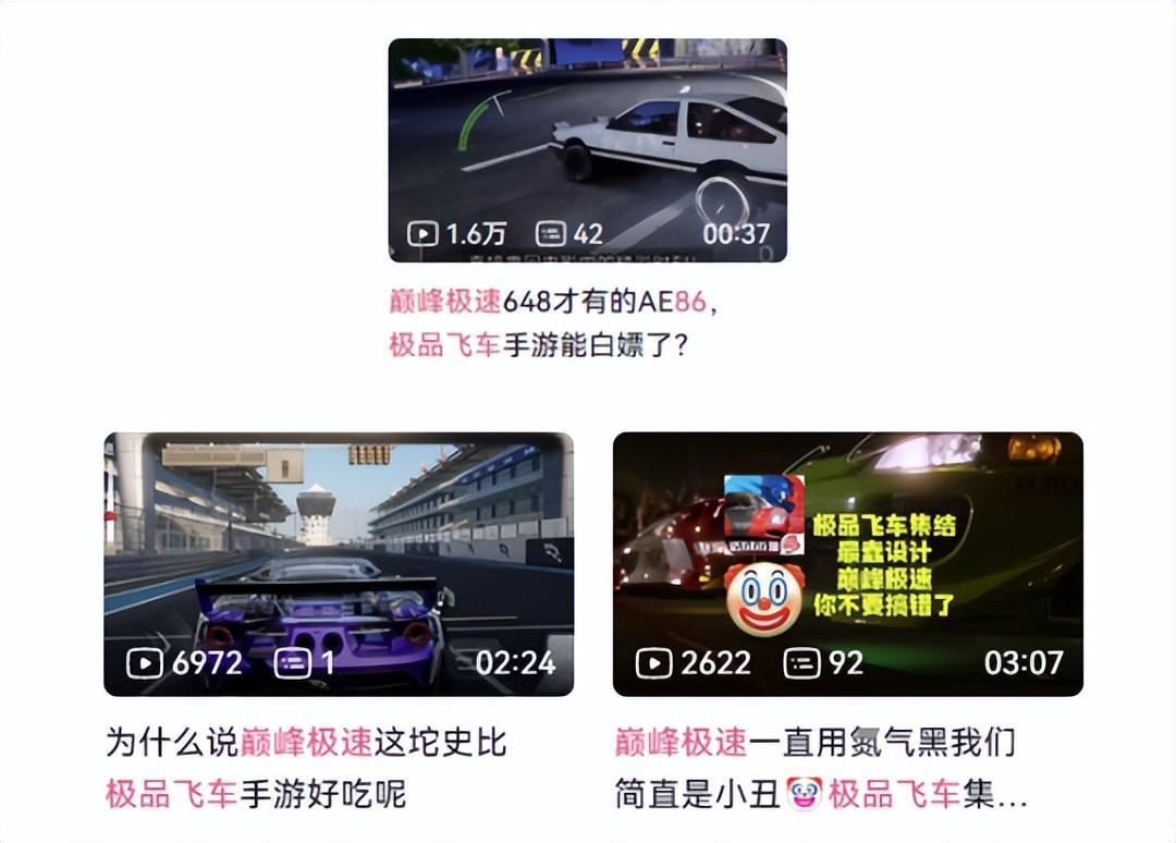 所以,這次商戰的主戰場變成了各大UP主的商單對轟,尤其是在《極品飛車:集結》剛公測那短時間內,幾乎每一條《極品飛車:集結》宣傳視頻都要蛐蛐下《巔峯極速》,而《巔峯極速》UP主也奮起反擊了不少。