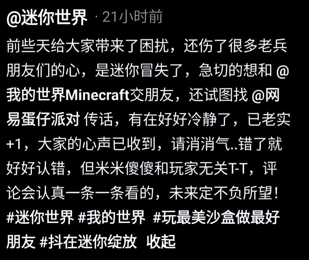 7月的另一個商戰大瓜則是《迷你世界》破天荒地喊話《我的世界》想要和好,把包括《我的世界》官方、MC玩家以及迷你玩家全都給整不會了。
